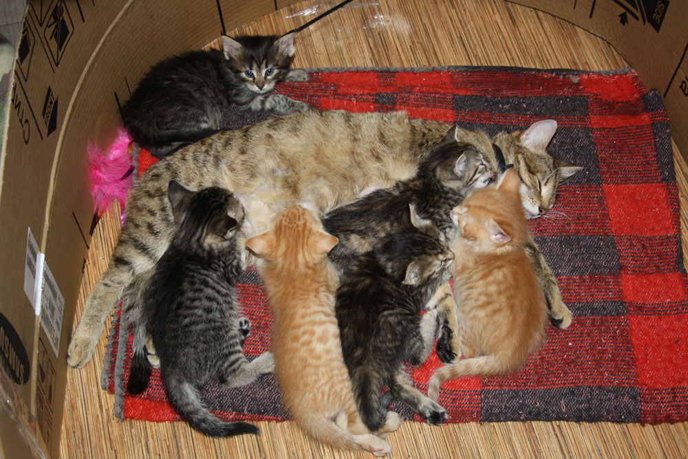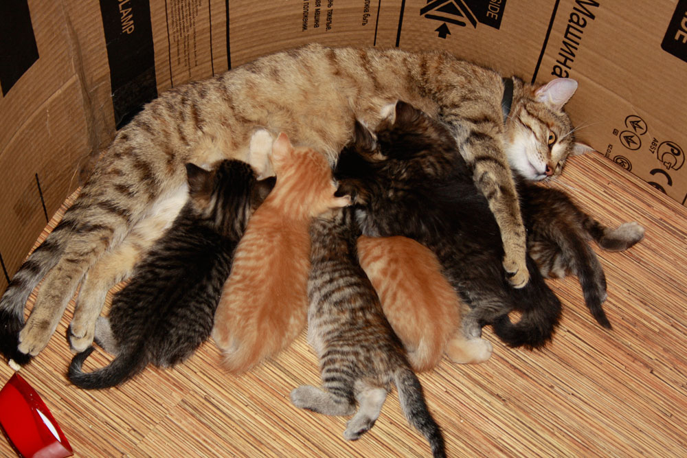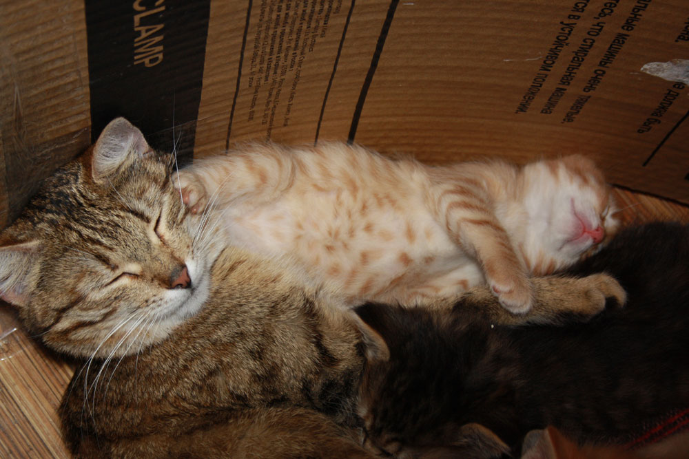 Котята уже такие большие, а все ещё сосут маму. Редкие моменты спокойствия. Кормление и послеобеденный сон